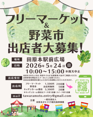 「駅前から田原本を元気に」を合言葉に、2026年 5月 24日(日)に「駅前フリマ+野菜市」開催します!