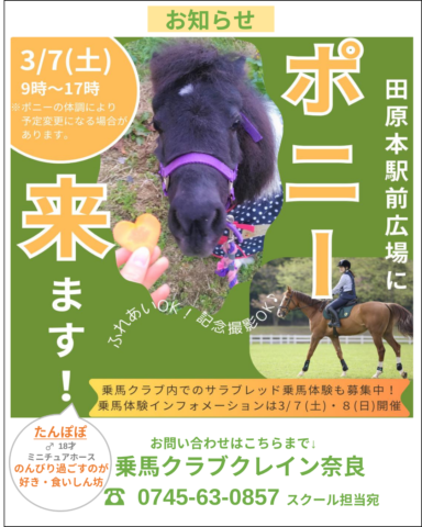 2026/2/20 【お知らせ】 3月7日(土)田原本駅前にポニーが来ます!!!!! 田原本駅前情報‼ 普段はキッチンカー等でにぎわっている 田原本駅前にポニーが来ます!!!!! 日程は3月7日(土) 9:00~17:00です。 当日はポニーとふれあいOK!記念撮影OK!です。 この機会にぜひ触れ合ってみてください!(^^)! ※天候やポニーの体調により予定変更になる場合がございます。 #田原本駅前広場 #田原本町 #クレイン奈良